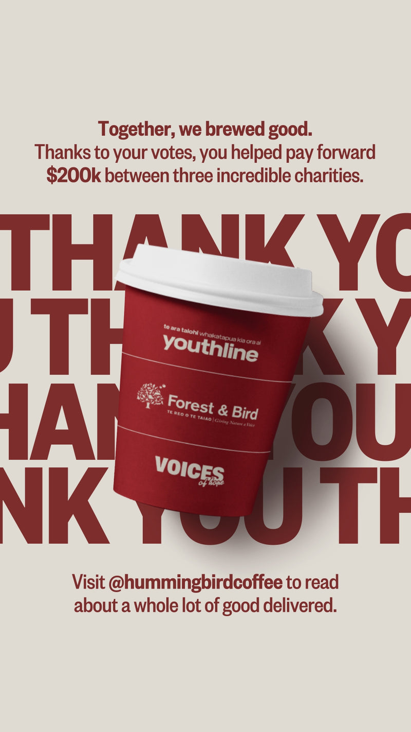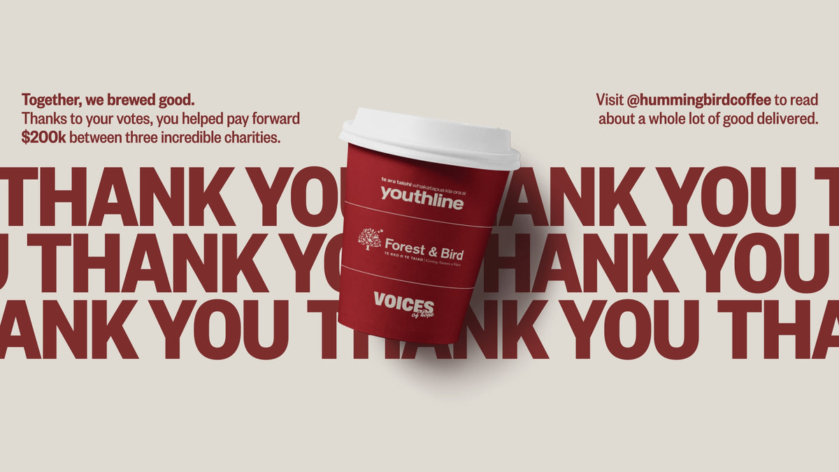 Photo of a cafe stocked with Hummingbird coffee beans and paper cups in front of a coffee machine.